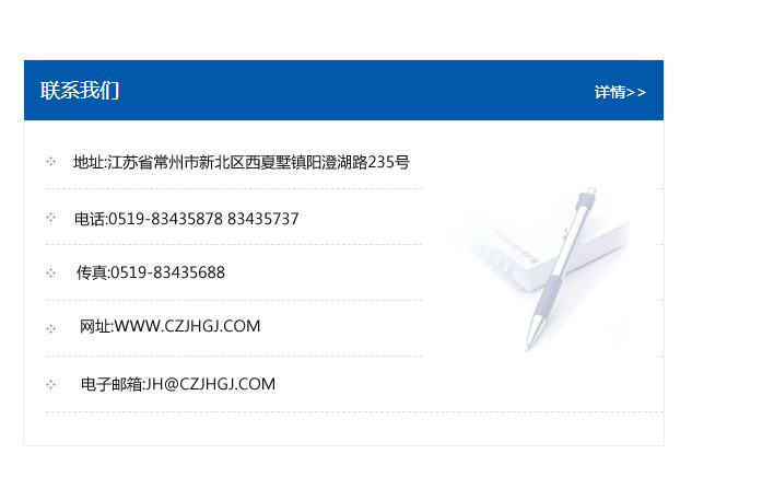 地址:常州市新北區友邦商務大廈1幢16、17層  電話:0519-85101652  傳真:0519-85112595  郵編:213022  網址:www.cz-jiayue_cn.hjmgh.com  郵箱:xiajifengaa@163.com